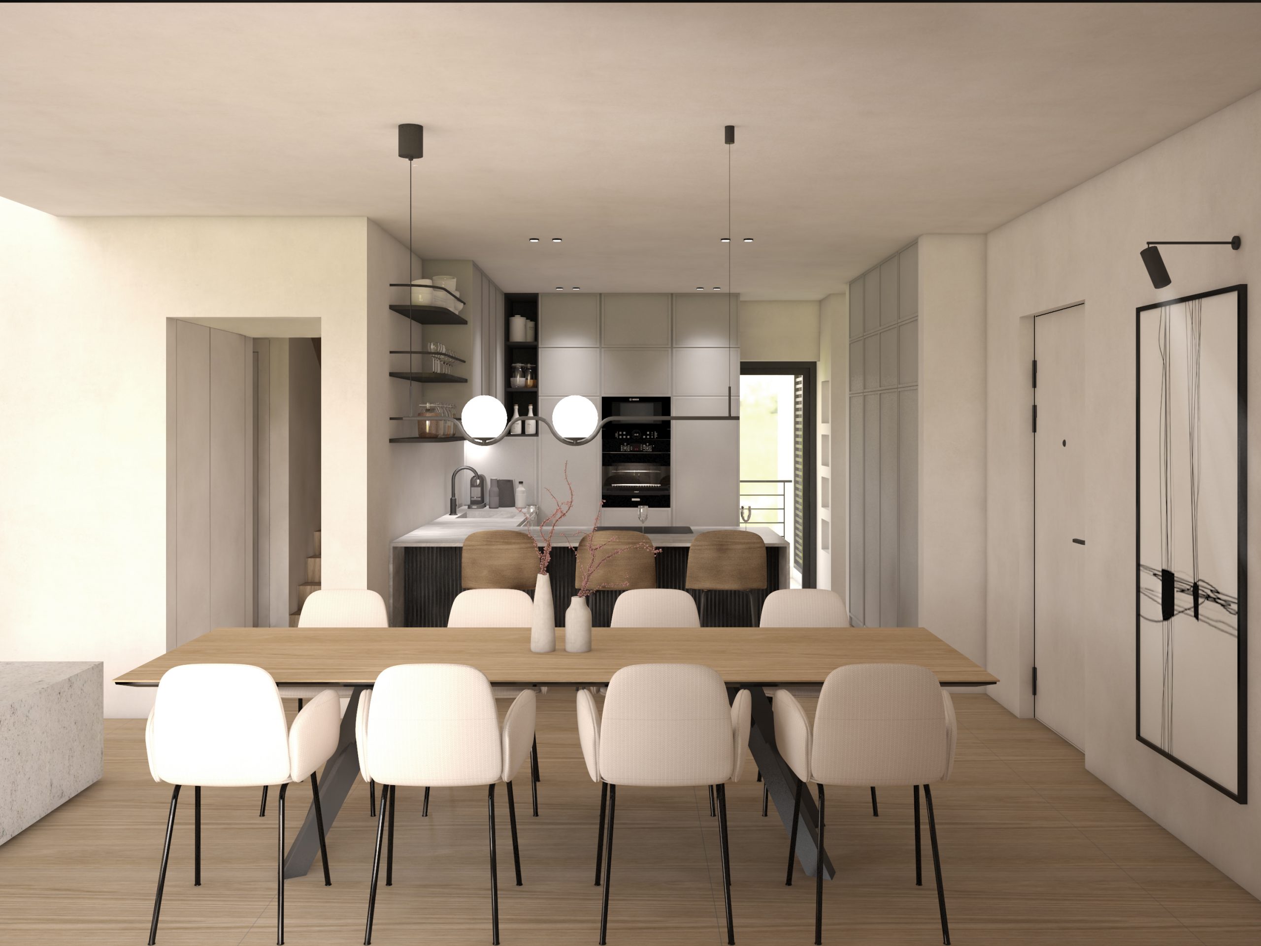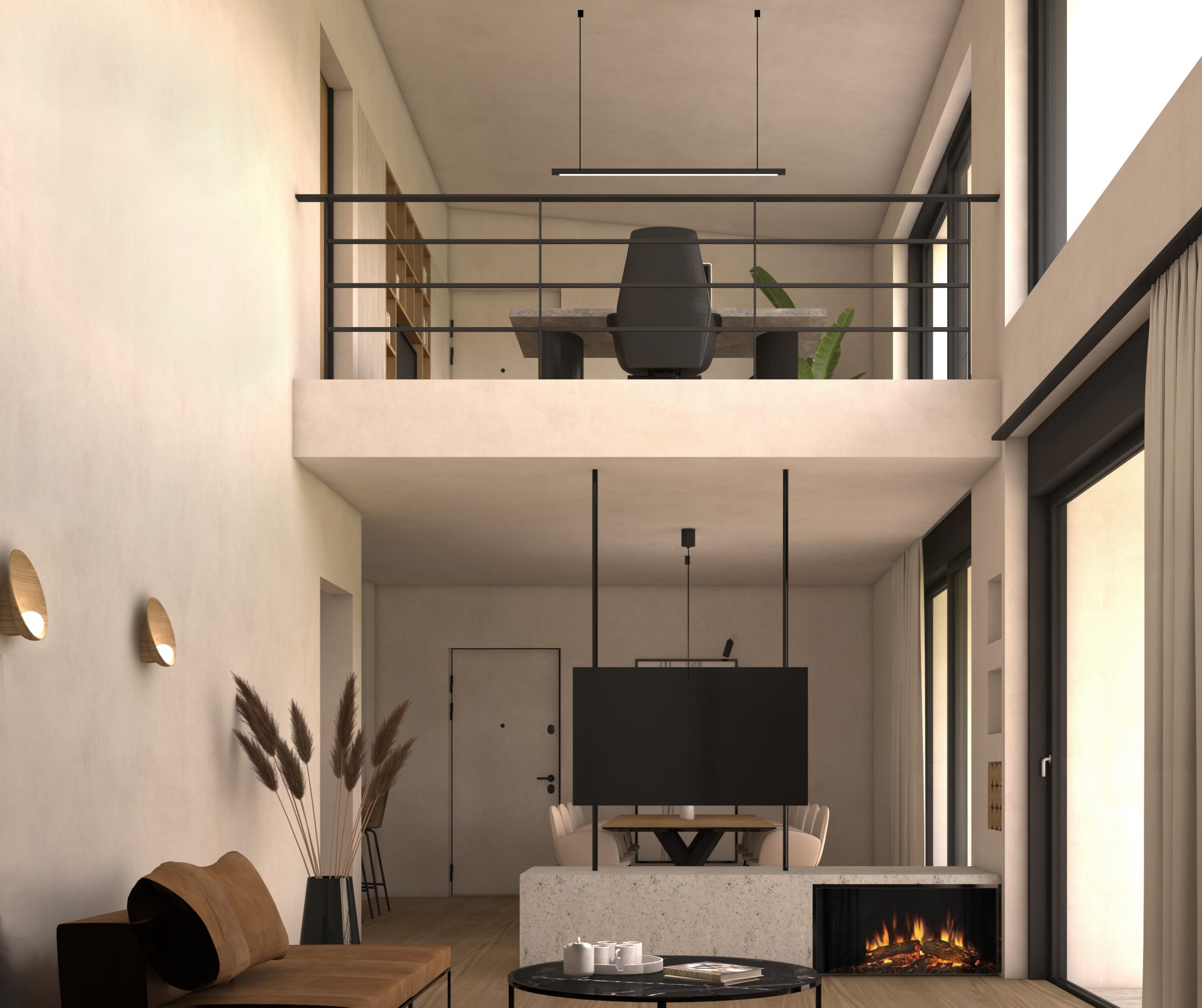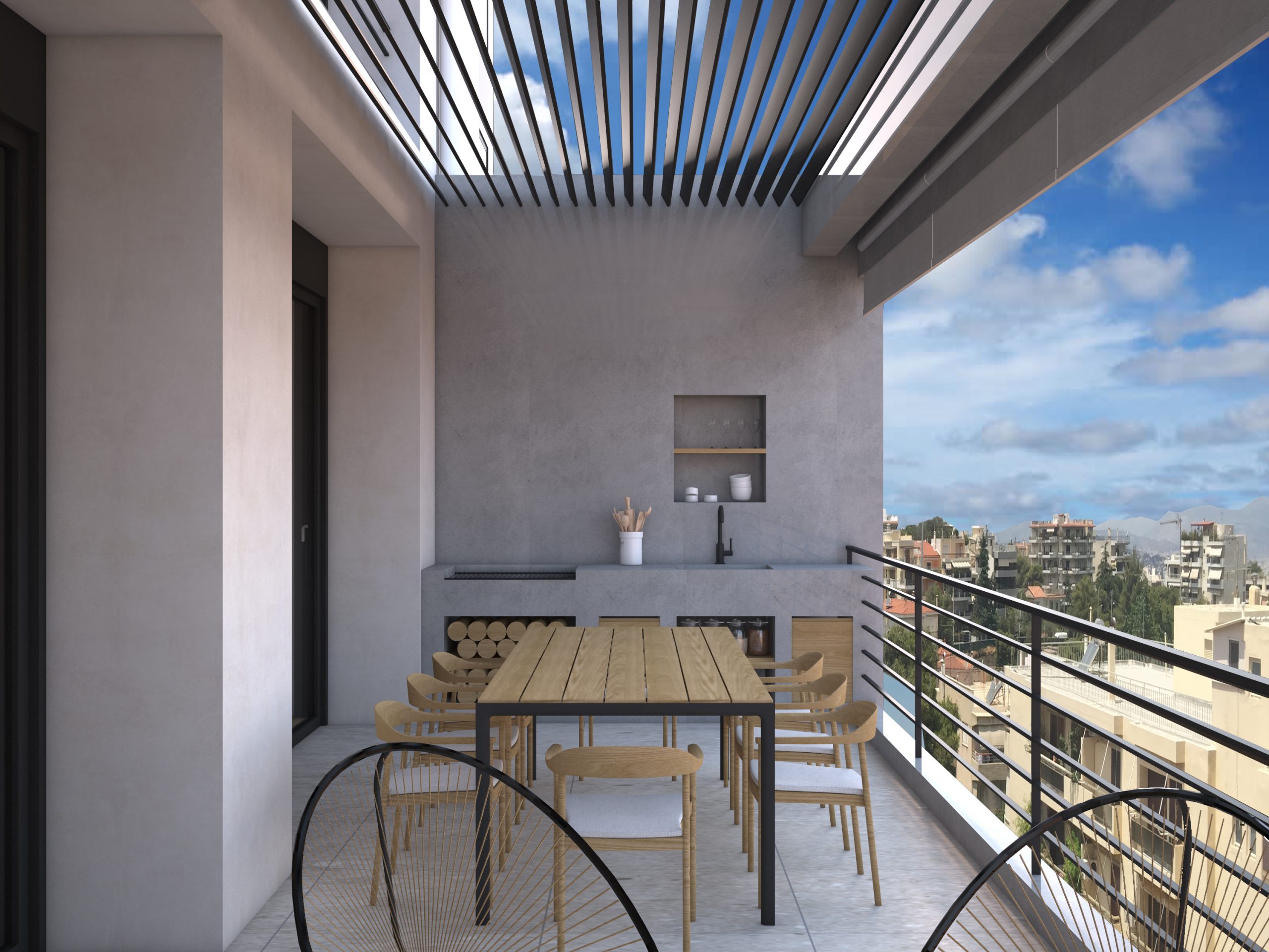 Η μεζονέτα του Δ’ ορόφου εκτείνεται σε δύο επίπεδα. Στο Δ’ όροφο, συνολικής επιφάνειας 104 τ.μ., βρίσκεται ο ενιαίος χώρος του σαλονιού – τραπεζαρίας και της κουζίνας με πρόσβαση στο μεγάλο μπαλκόνι 29,5 τ.μ. της πρόσοψης της πολυκατοικίας. Στο επίπεδο αυτό βρίσκεται ένα master υπνοδωμάτιο με εσωτερικό λουτρό, ένα WC καθώς και χώρος αποθήκης-laundry. Η εσωτερική σκάλα οδηγεί στη σοφίτα – πατάρι, συνολικής επιφάνειας 71 τ.μ. όπου βρίσκονται 2 μεγάλα υπνοδωμάτια, ένα λουτρό καθώς και ένας μεγάλος χώρος γραφείου. Και τα τρία υπνοδωμάτια έχουν πρόσβαση στους εξώστες της πίσω όψης του κτηρίου. Το διαμέρισμα διαθέτει αντλία θερμότητας, ενδοδαπέδια θέρμανση, ξύλινα πατώματα και ενεργειακό τζάκι.