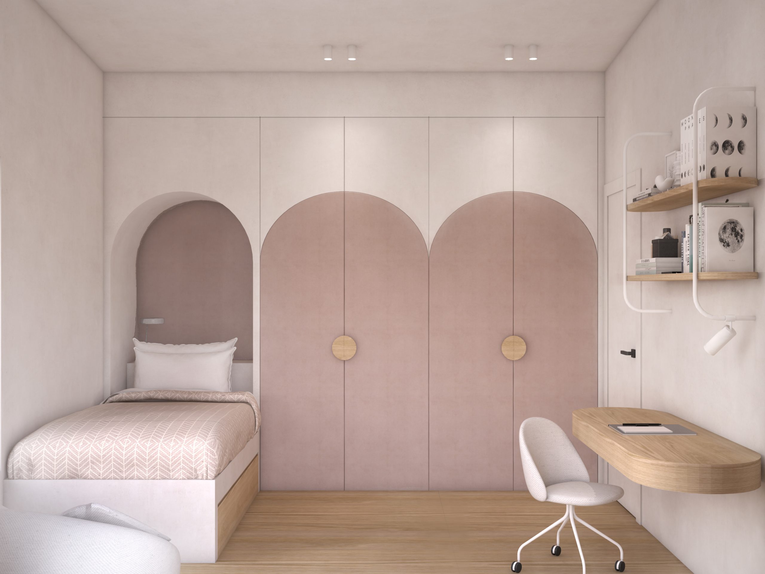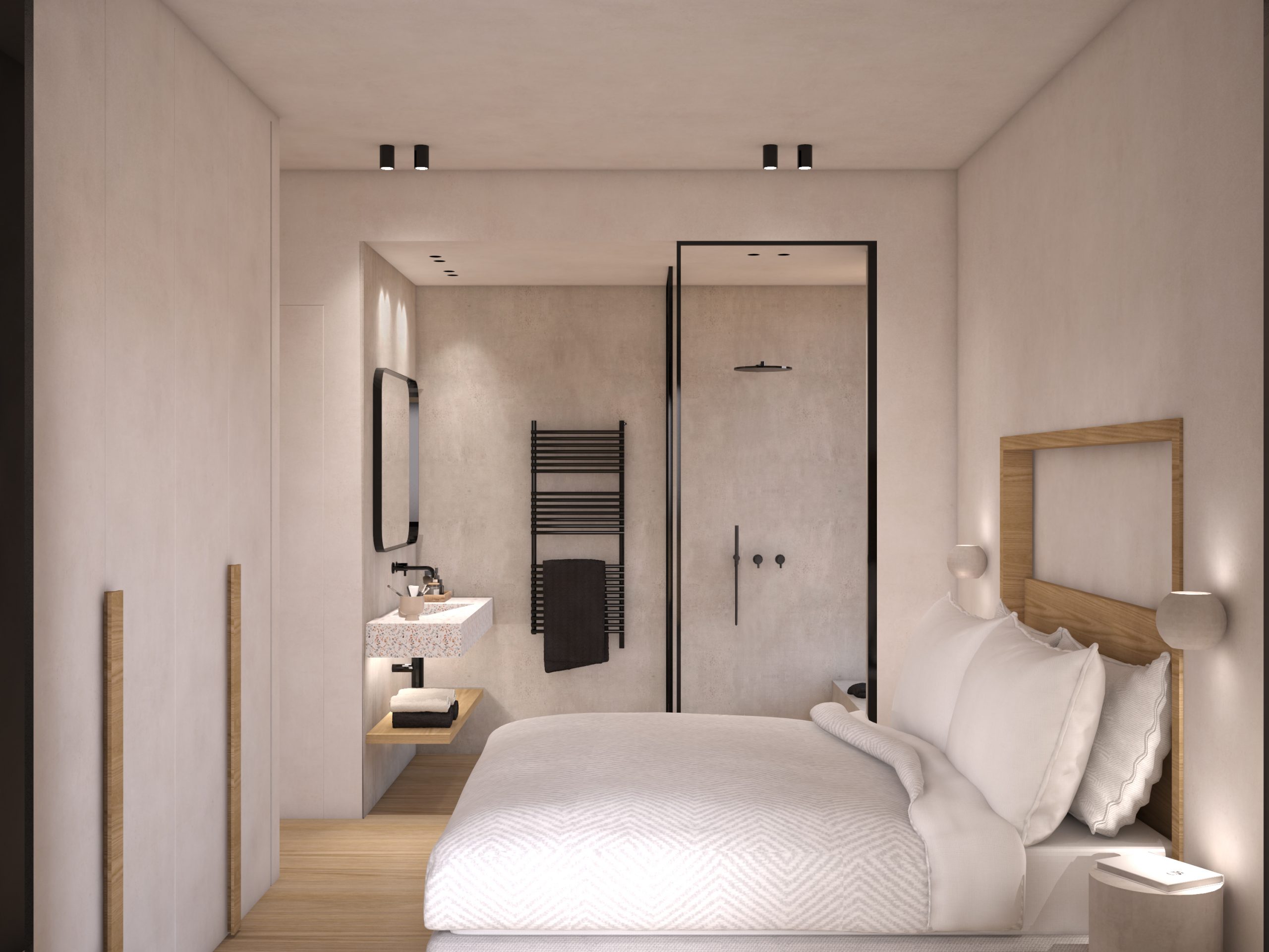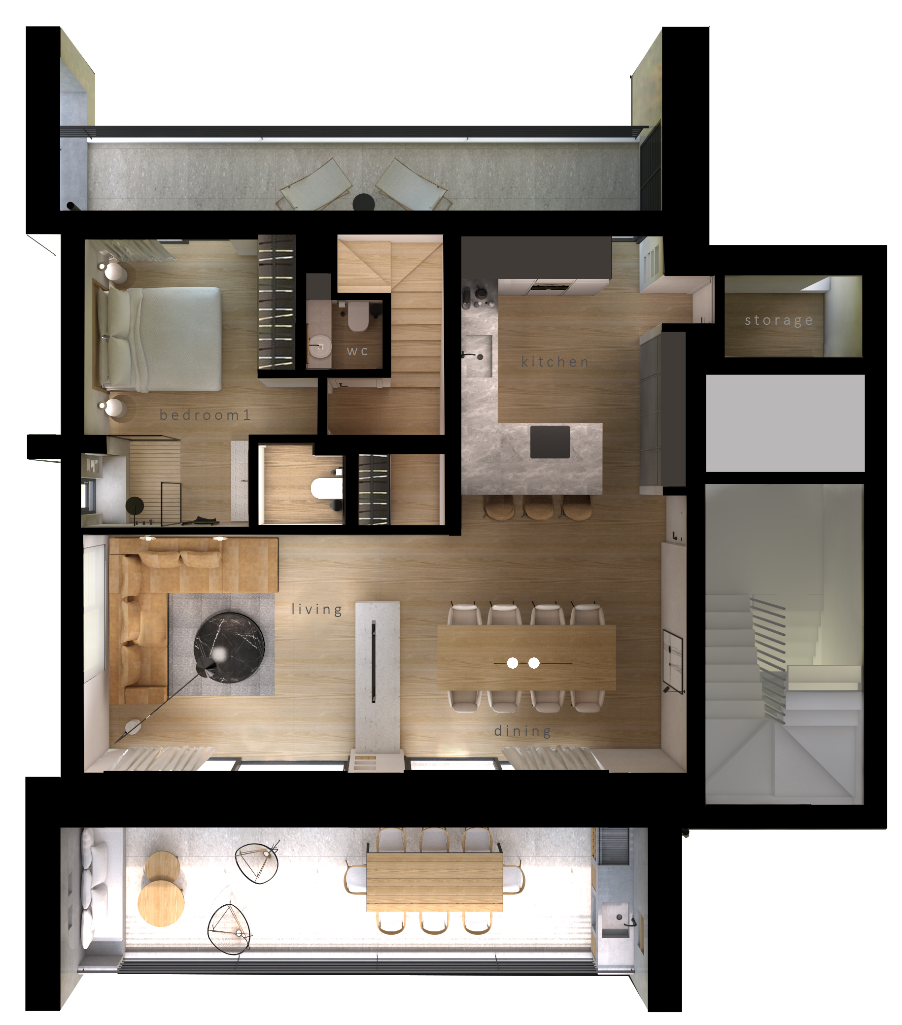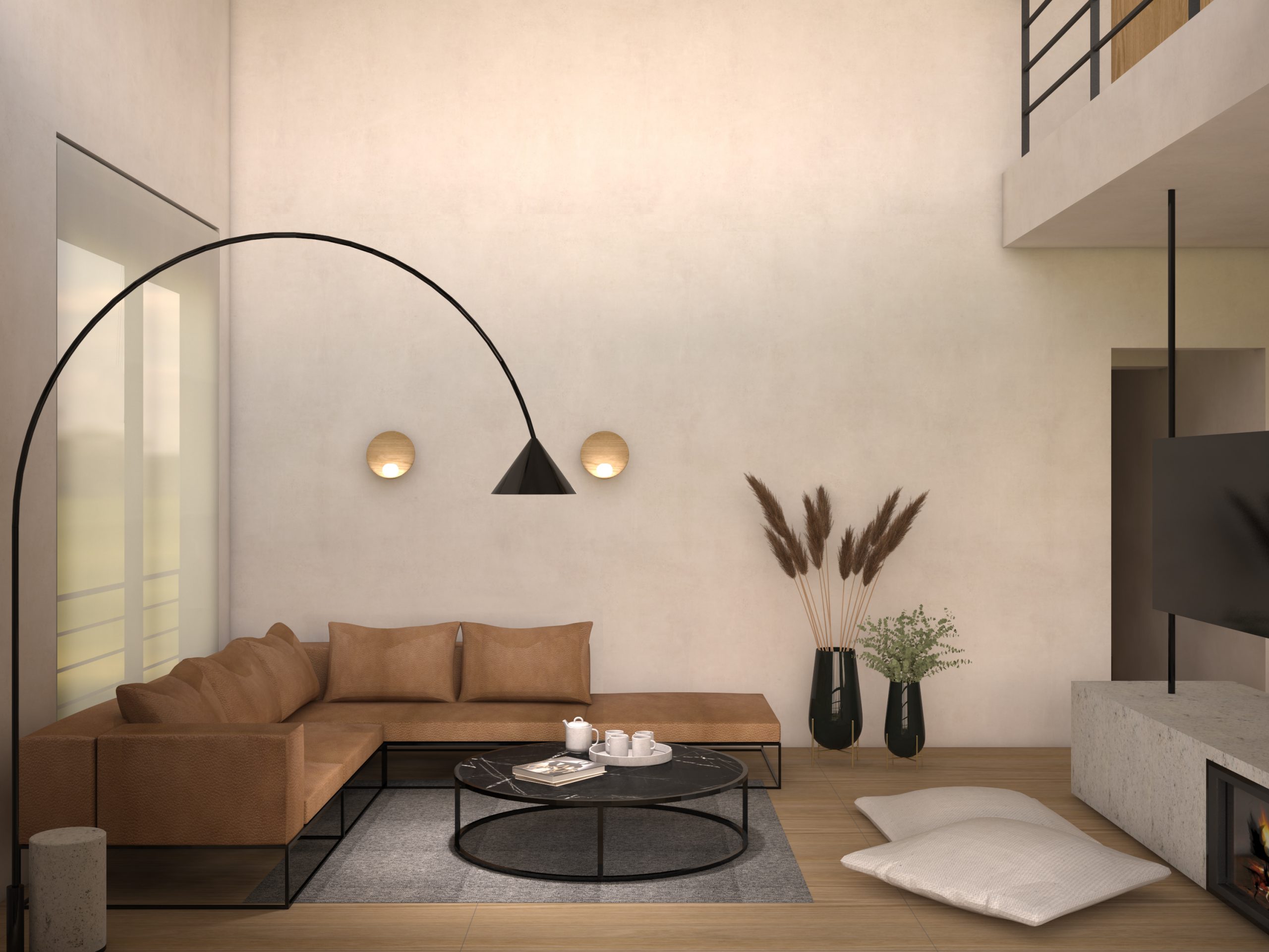 Η μεζονέτα του Δ’ ορόφου εκτείνεται σε δύο επίπεδα. Στο Δ’ όροφο, συνολικής επιφάνειας 104 τ.μ., βρίσκεται ο ενιαίος χώρος του σαλονιού – τραπεζαρίας και της κουζίνας με πρόσβαση στο μεγάλο μπαλκόνι 29,5 τ.μ. της πρόσοψης της πολυκατοικίας. Στο επίπεδο αυτό βρίσκεται ένα master υπνοδωμάτιο με εσωτερικό λουτρό, ένα WC καθώς και χώρος αποθήκης-laundry. Η εσωτερική σκάλα οδηγεί στη σοφίτα – πατάρι, συνολικής επιφάνειας 71 τ.μ. όπου βρίσκονται 2 μεγάλα υπνοδωμάτια, ένα λουτρό καθώς και ένας μεγάλος χώρος γραφείου. Και τα τρία υπνοδωμάτια έχουν πρόσβαση στους εξώστες της πίσω όψης του κτηρίου. Το διαμέρισμα διαθέτει αντλία θερμότητας, ενδοδαπέδια θέρμανση, ξύλινα πατώματα και ενεργειακό τζάκι.